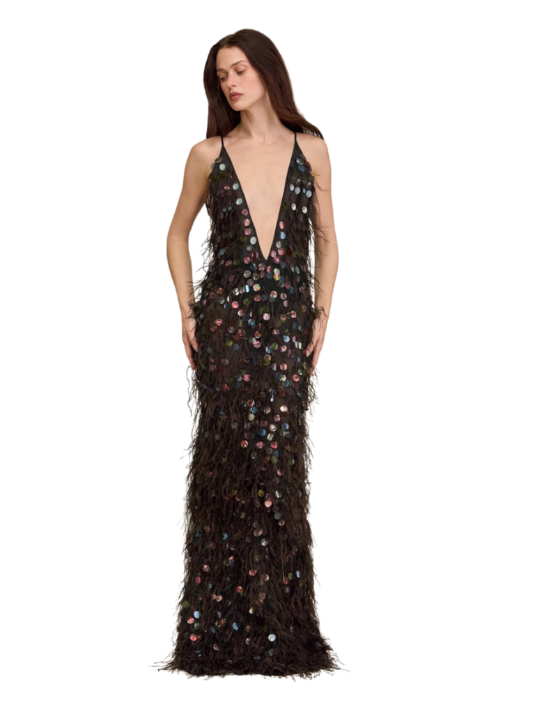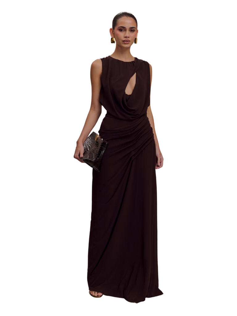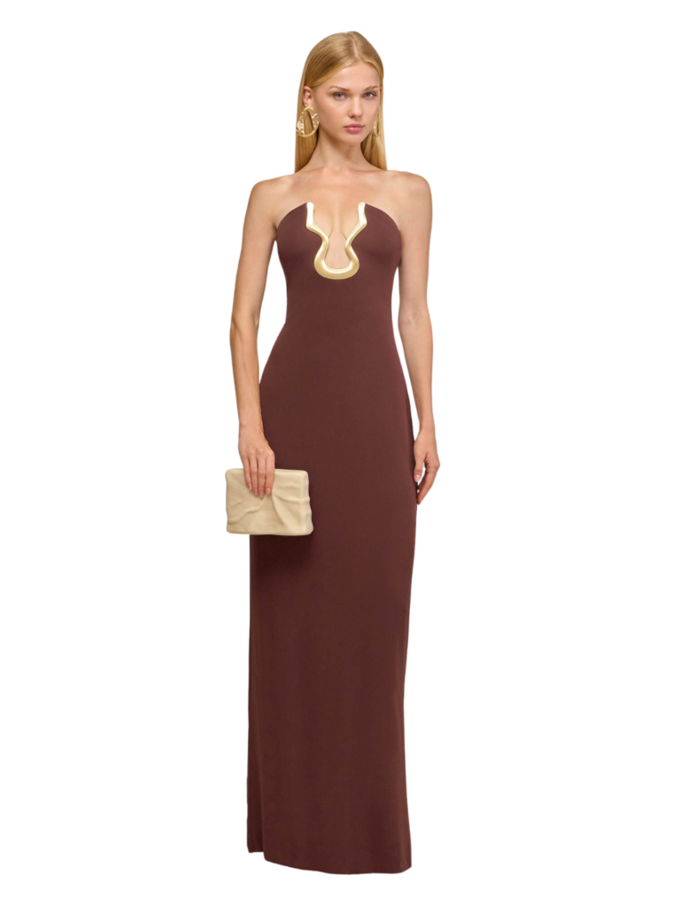 Effortlessly bold and endlessly chic, the Abril maxi in Java combines sleek structure with subtle sparkle. The tailored stretch-crepe body offers a flattering fit, while the signature Cult Gaia gold hardware cutout along the neckline adds just the right touch of glamour, perfect for autumn evenings and dramatic receptions.