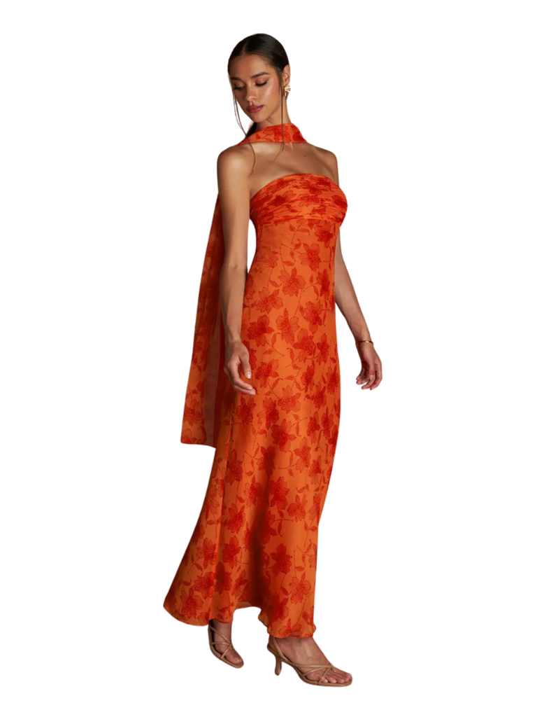One of the best parts of Autumn is the rich tones of changing leaves; it just makes sense to don the most iconic shade for the season, orange! The Aisha Tangerine Maxi dress from Azazi is the perfect ensemble for the turn of the season, especially when paired with the matching scarf.