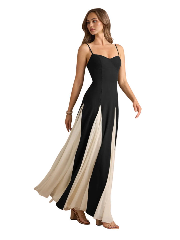Turn heads in the Jessenia Maxi Dress. With a chic a-line silhouette and bold colour-blocked panels, this monochromatic ensemble is beautifully demure and perfect for most weddings. Keep the rest of the look minimal to let the dress do the talking. Pair it with strappy heels, a slim clutch and a simple up-do to let those flowing chiffon panels remain the centrepiece.