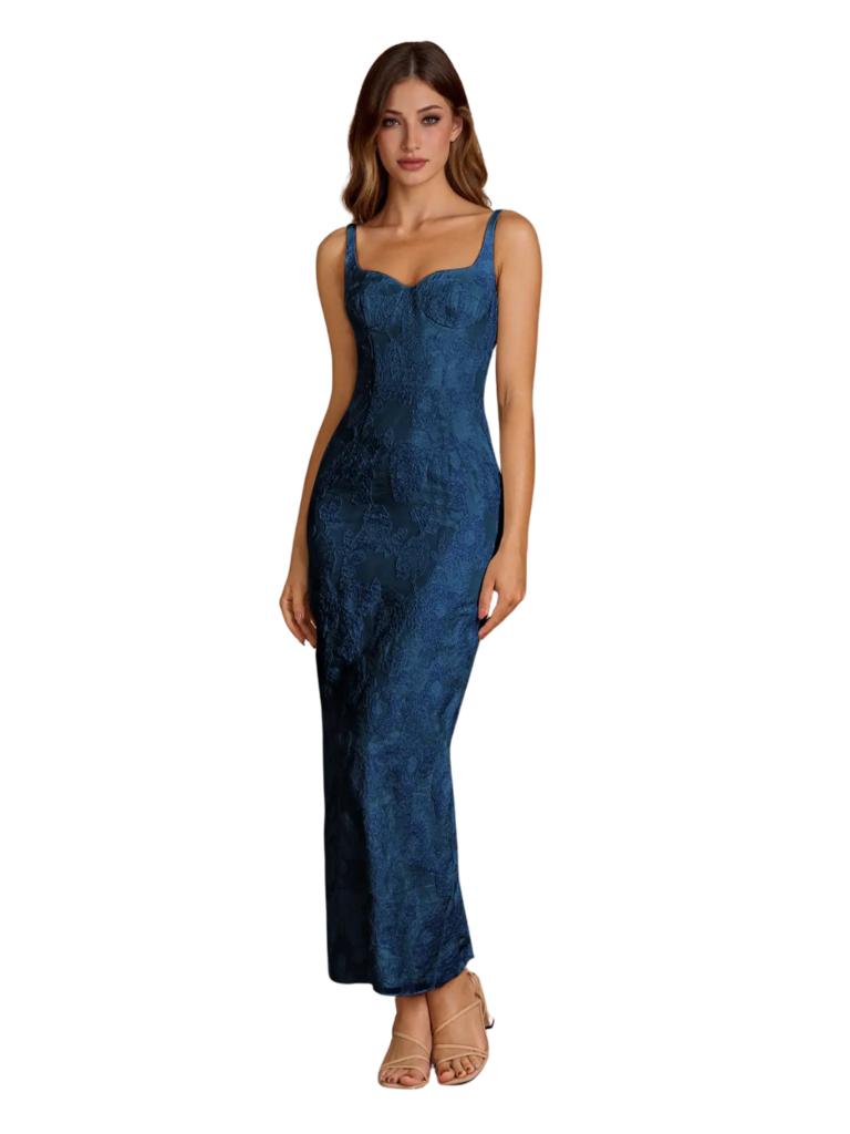 Turn heads at your next special occasion in the Odette Maxi Dress. This floral burnout beauty features a romantic sweetheart neckline, adjustable spaghetti straps, and an ankle-length skirt with a subtle back slit, making it effortlessly chic for any autumn wedding or evening event. Soft waves or a loose updo will really complement the romantic vibe of this dress.