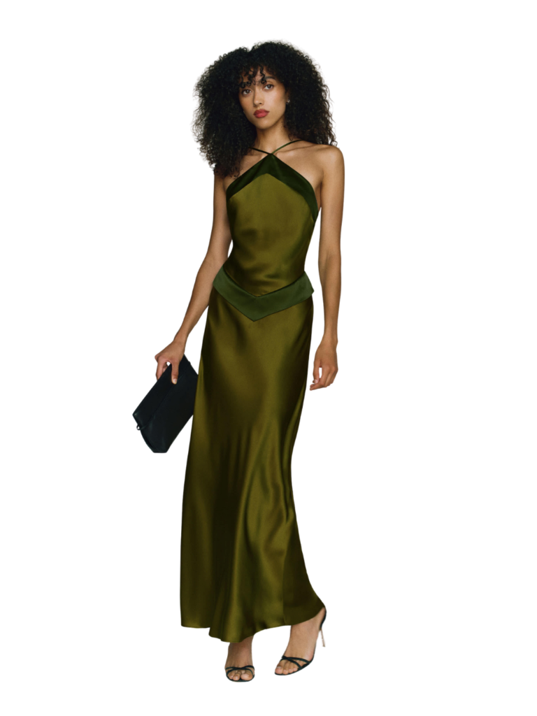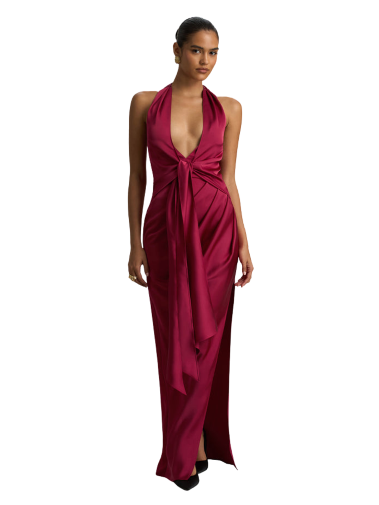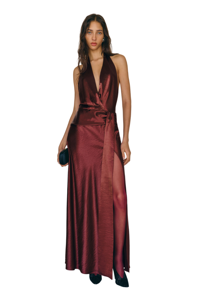 Sleek, refined, and sexy, the Oceane dress from Reformation in the shade Merlot is the perfect moody party dress for this wedding season. Easy to dress up or down, you might be surprised at how truly versatile the halter neck gown can be.