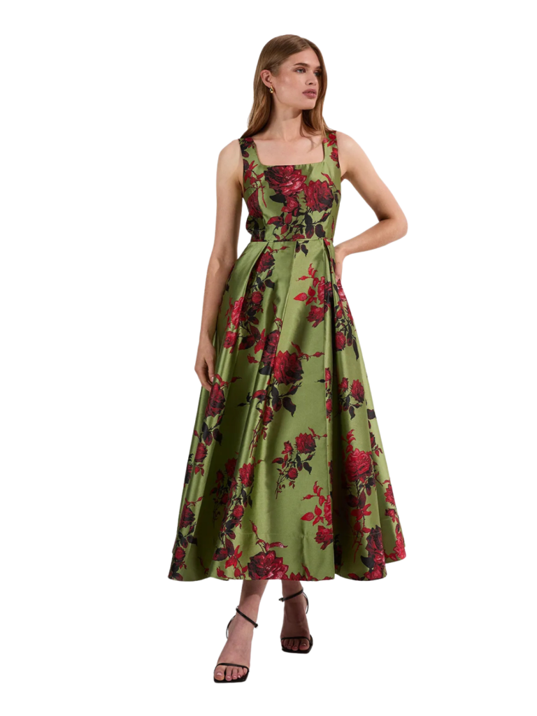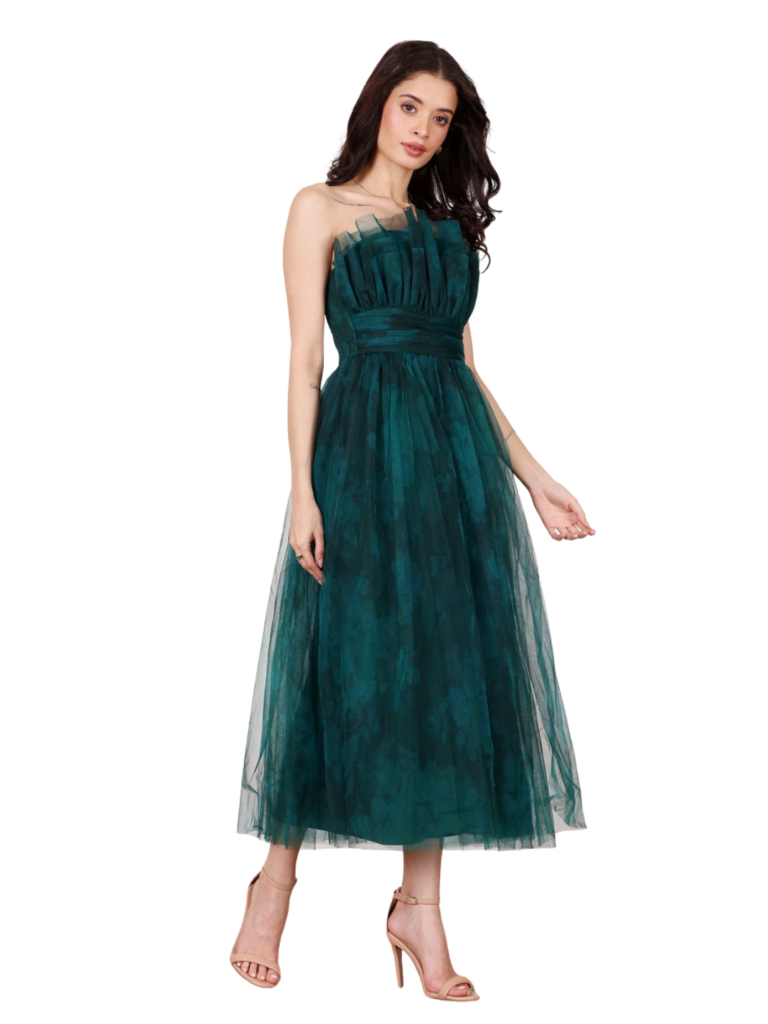 The effortlessly chic Nusrat Midi dress in Jade Green Floral pairs a refined skirt with a standout floral bodice, creating the perfect blend of elegance and charm. Made from delicate tulle, it features a strapless, voluminous bodice that feels feminine and fun. Perfect for twirling on the dance floor!