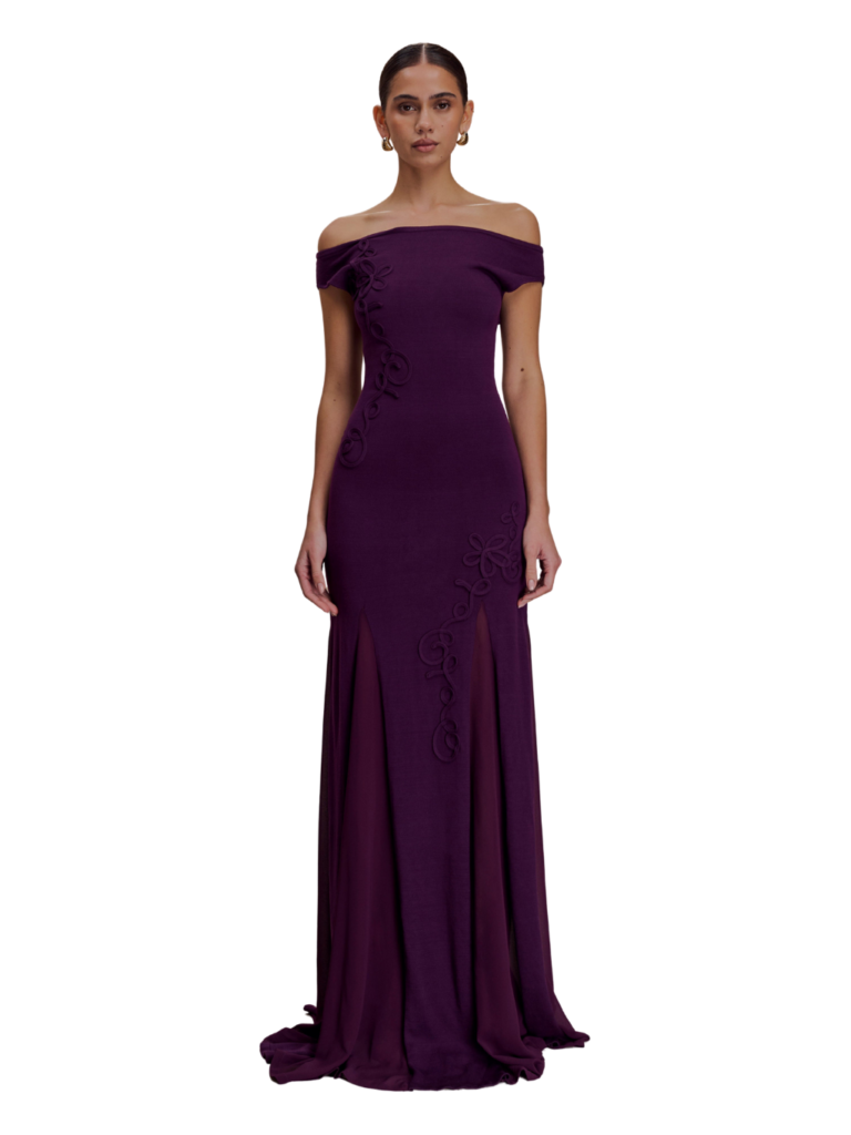 This dress is the definition of effortless elegance. The flattering Bardot neckline and figure-hugging knit base of the Nesta Gown create a sleek silhouette, while floral embroidery and chiffon godets add a touch of romance and movement. Ideal for autumn weddings, garden parties, or evening events where you want to look chic without sacrificing comfort.