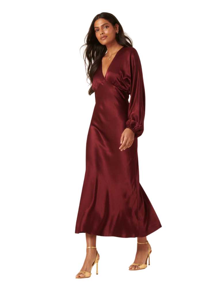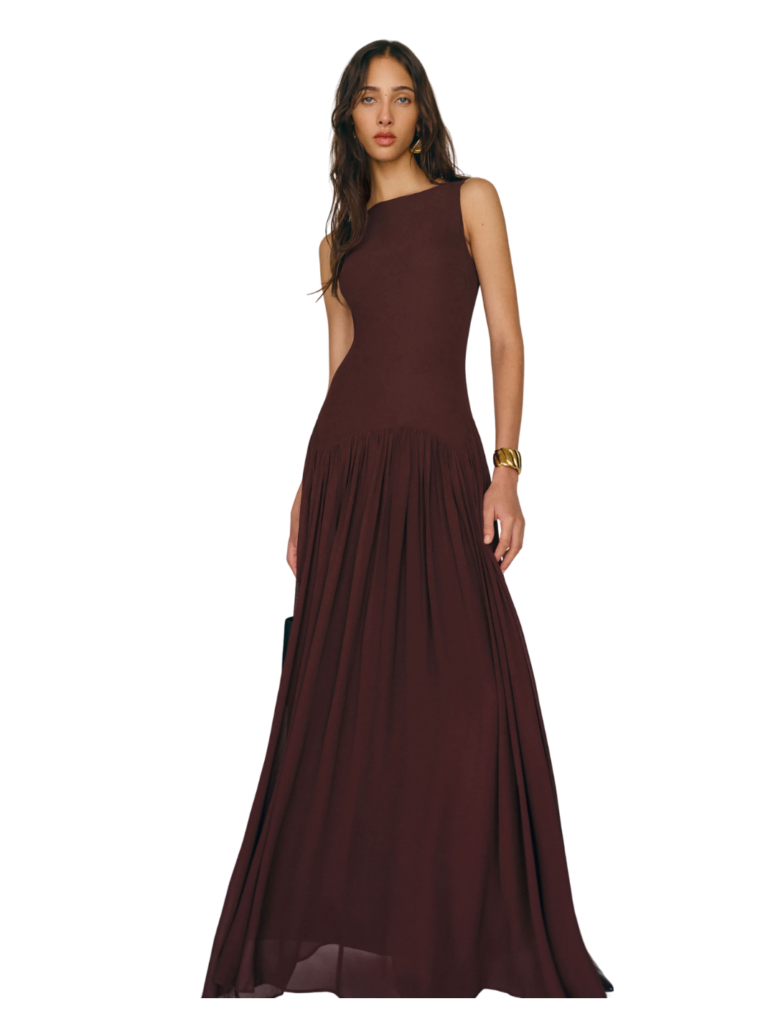 If you’re after a dress that’s classic but still moves beautifully, the Camella Dress from Reformation in Mahogany is a perfect pick. The fitted bodice and boat neckline flatter your shape, while the pleated midi skirt adds movement and a playful touch. Pair it with metallic block heels, a structured clutch, and soft waves or a low bun for a look that’s polished, effortless, and modern.