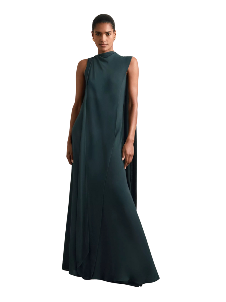 Crafted from elegant crepe, the Greta gown features a dramatic split cape that cascades down the back, complemented by a detachable chiffon underlayer that adds subtle depth and graceful movement. The deep teal hue and maxi length make it perfect for refined occasions like a formal black tie wedding.