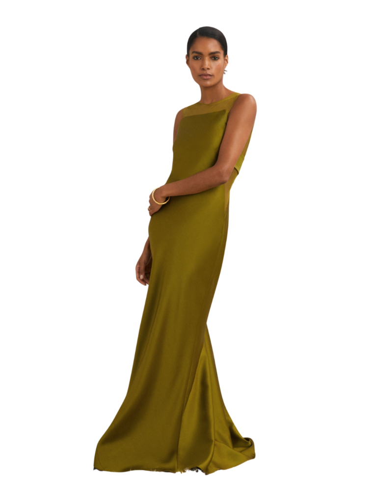 Crafted from lustrous duchess satin, the OPI Maxi Dress from Reiss is an incredible choice for an Autumn black tie wedding. Designed to fall with an elegant, fluid drape, the sheer mesh panels soften the topline and accentuate the back cut-outs, making it a fab choice for somebody wanting to show a little skin but still stay modest for a more formal affair.