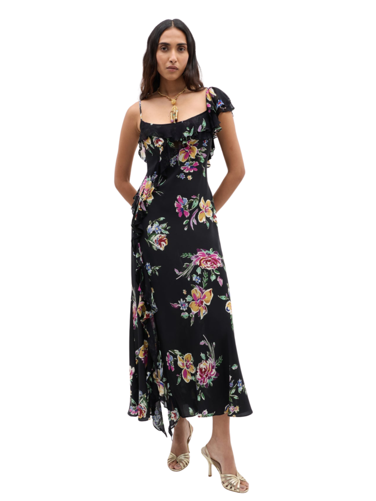 In a nod to ‘90s slip dresses, the Ester dazzles with jacquard floral motifs, an asymmetric neckline, soft ruffles, and a bias cut silhouette that skims the figure beautifully. A moodier version of the perfect garden party dress, pair it with muted gold or gunmetal accessories and loose waves for a laidback and feminine look.