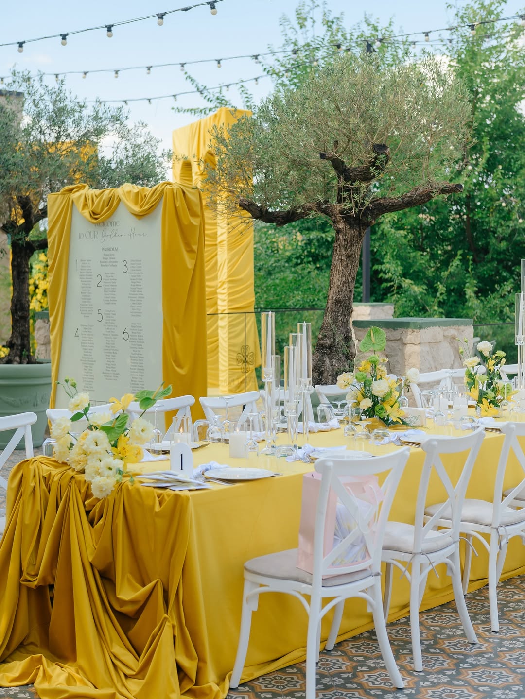 Lago Event ParkFor a long time, couples have been a bit cautious around yellow, but when it’s done well, it can be incredibly chic. Paired with soft neutrals, warm whites or muted greens, it adds personality without overpowering everything else. This palette is especially gorgeous for outdoor weddings, summer celebrations or venues flooded with natural light. It works beautifully with seasonal florals, relaxed tablescapes and a more laid-back atmosphere.