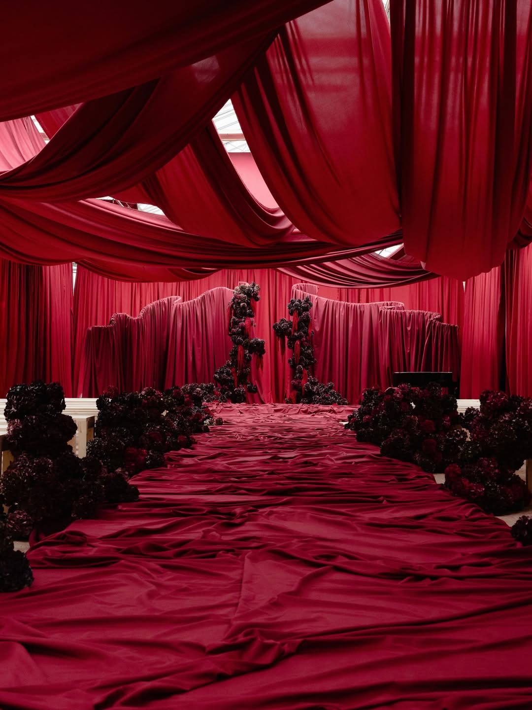 Erik WinterOlive green plays a big role here. It softens the deeper reds and keeps everything grounded, stopping the palette from feeling too formal or overpowering. It also ties in beautifully with natural surroundings and foliage-heavy styling.