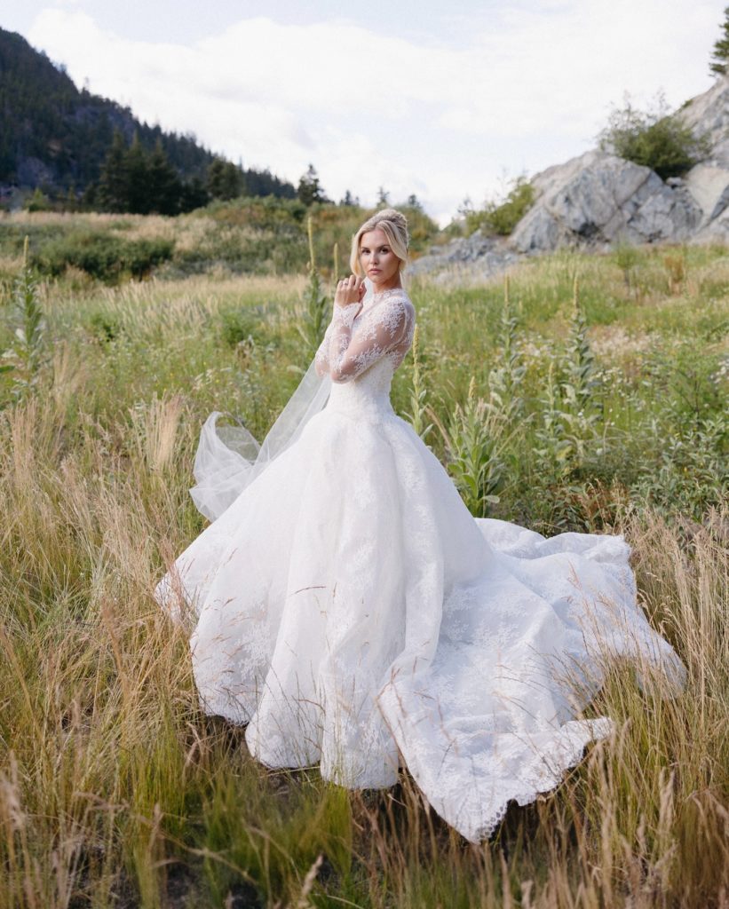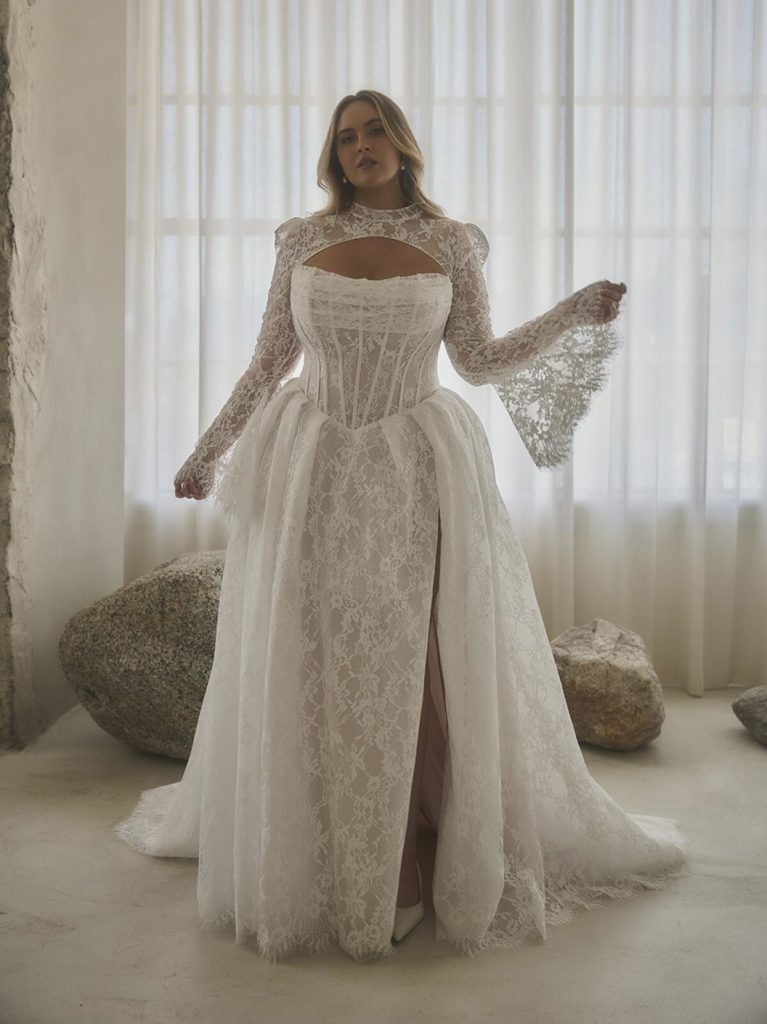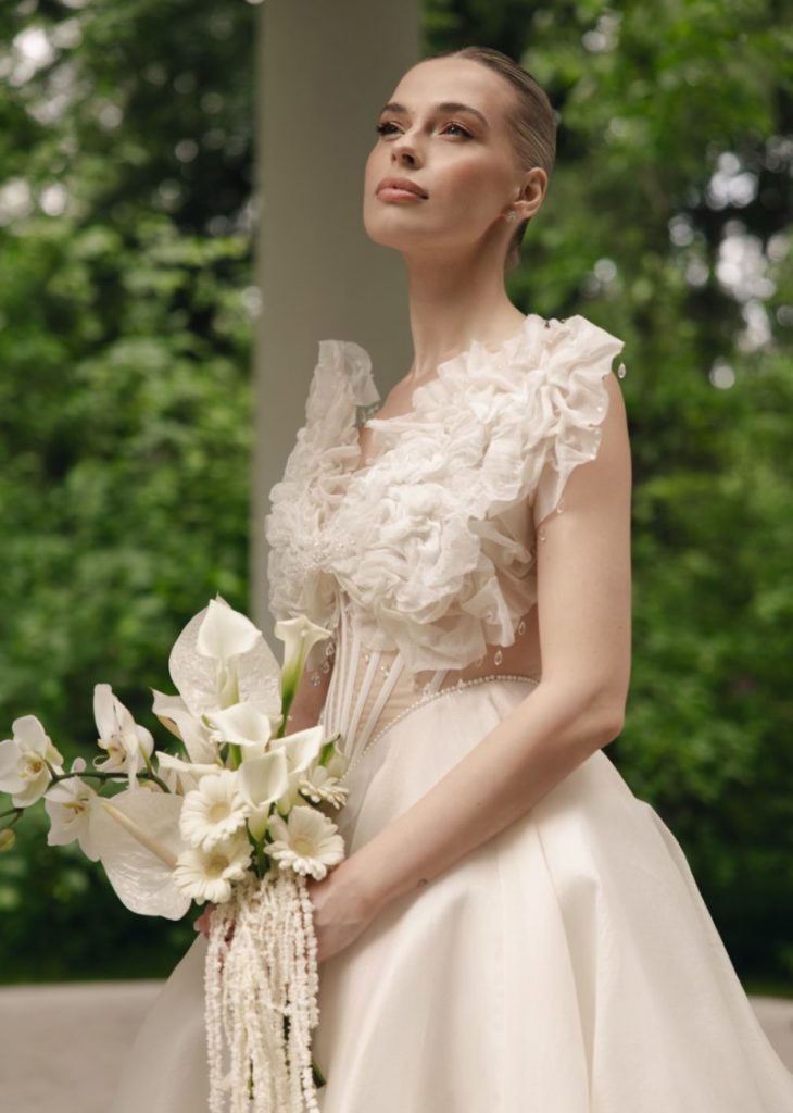 Flowing chiffon gowns, layered tulle, natural silks, and light linen all suit this softer white beautifully, mainly because they allow the fabric itself to shine. Movement, texture and cut become the focus, which is ideal if you are drawn to simple silhouettes or unfussy tailoring. For brides who want something timeless but not overly formal, this tone feels wearable and natural rather than stiff.