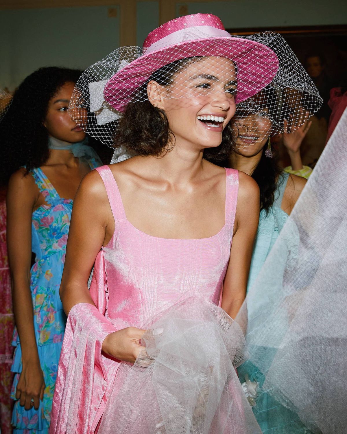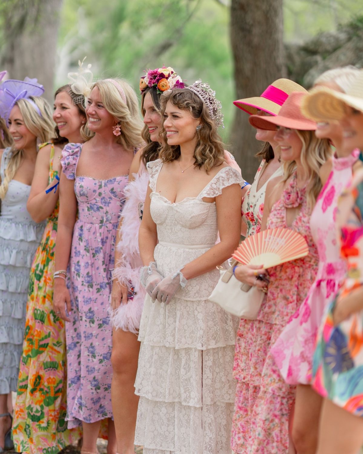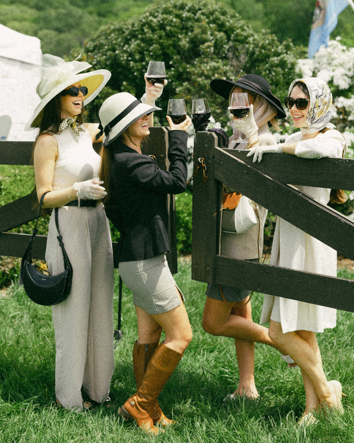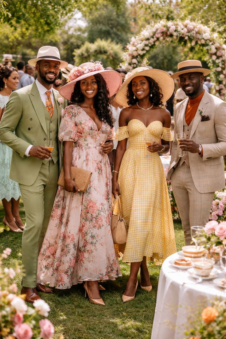 That mix makes photos feel natural instead of forced. Headpieces are part of the fun. A simple fascinator, a padded headband, a structured hat or even a statement bow can finish the look. If some of the group are not those people, that is fine. Polished hair and strong accessories still work.