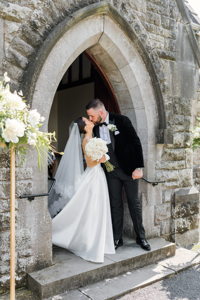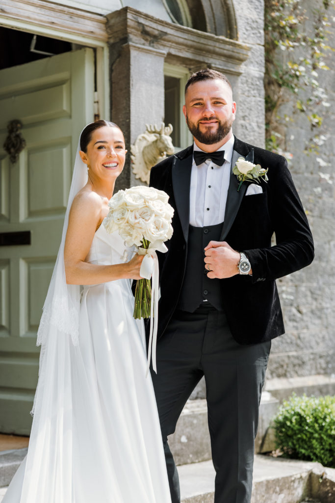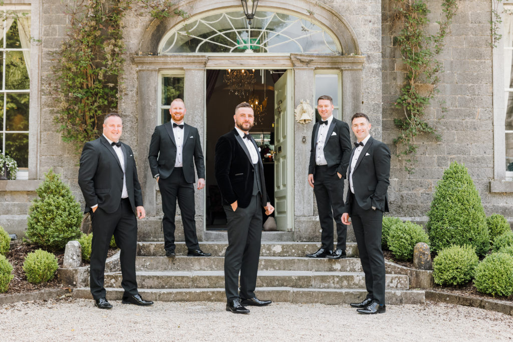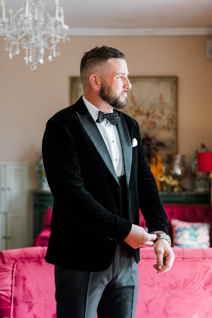 "We wanted something timeless and classic. As he would regularly wear suits as a wedding guest or to formal events, he wanted something different for his own wedding. David wore a tux with a velvet suit jacket & waistcoat to stand out from the groomsmen."