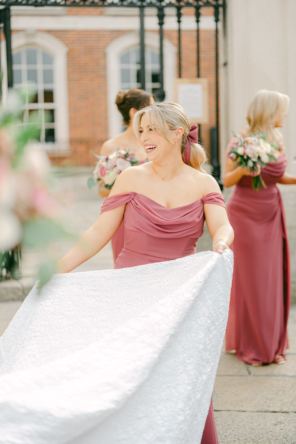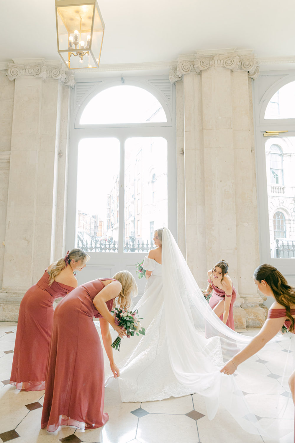 Amy's four bridesmaids were her friends Shianne, Eva & Charlotte, and her now-sister-in-law Aebhin. The group had a gorgeous day out in Folkster South William St, joined by Amy's mum and mother-in-law. The girls tried on the different styles and colours of gowns, and eventually landed on the Austen style in the shade Marsala.
