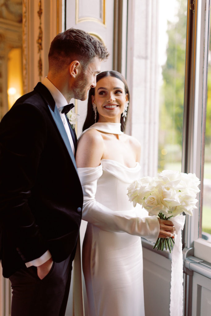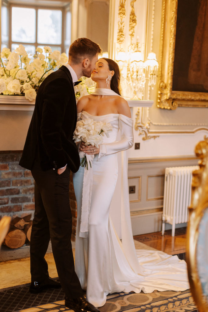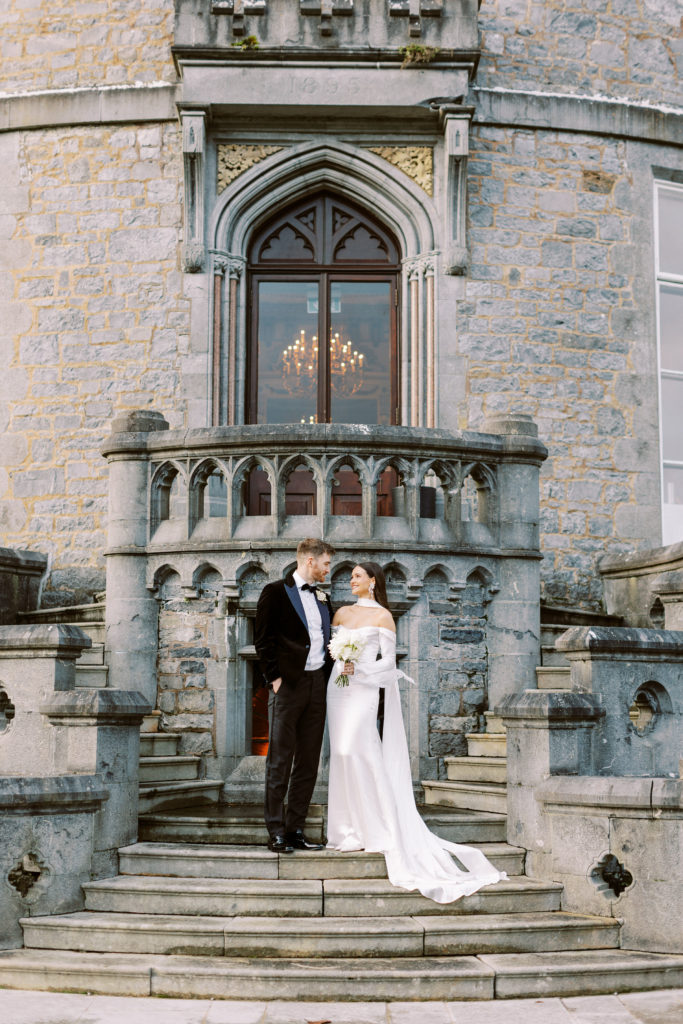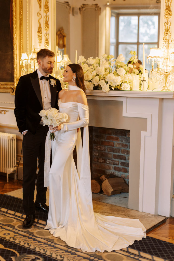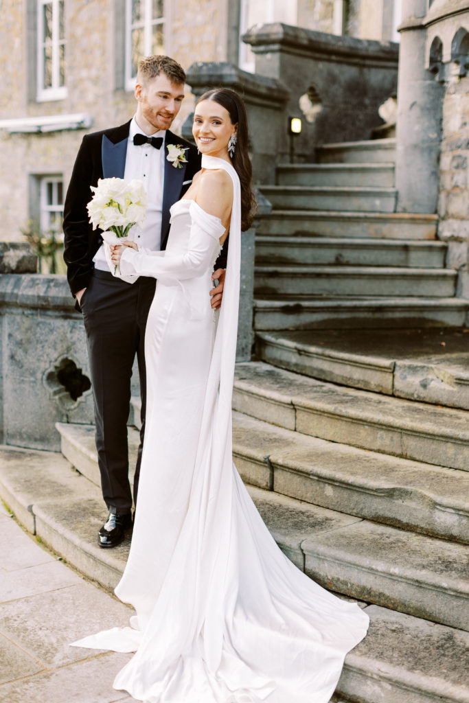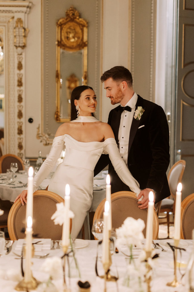 "Markree Castle was the first venue we viewed, and it was love at first sight for both of us." Wandering through the castle, soaking in period features and furnishings, and the breathtaking dining rooms, you get a real sense of the authentic, old-world charm that you can only find in such a historic space. "We fell in love with everything about the place. For us, it was the perfect Christmas venue." To match their otherwise clean and refined aesthetic, the couple kept the decor simple for the reception. Decorating the tables with a serious amount of white taper candles in antique gold holders, black bows and single stem white roses for an elegant wintery look.