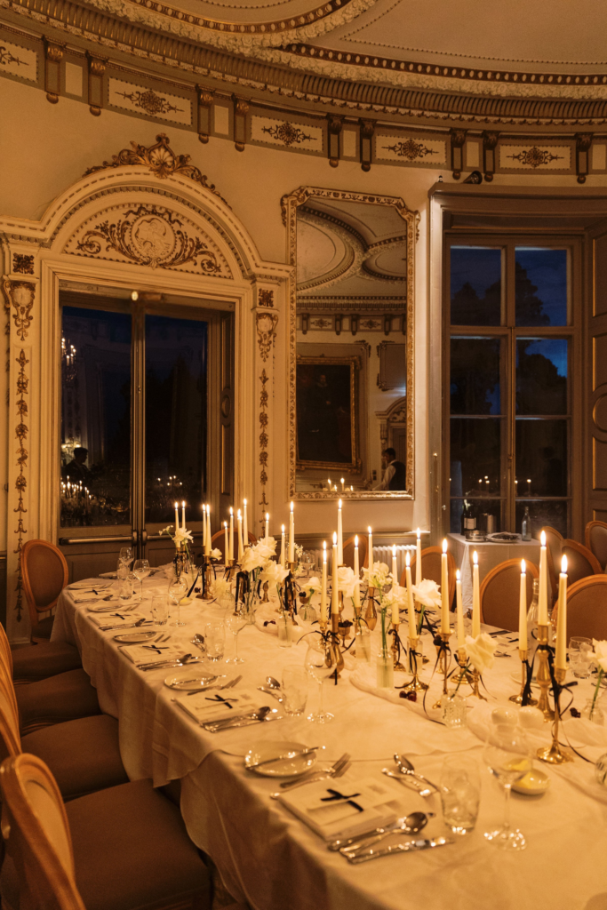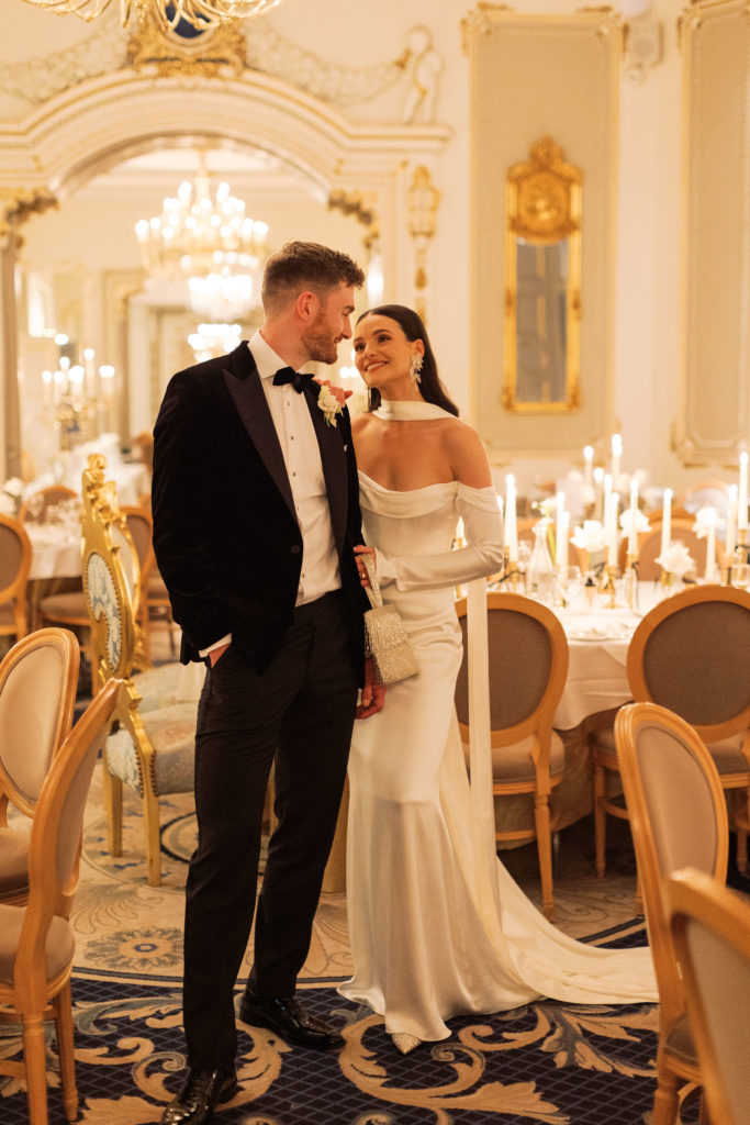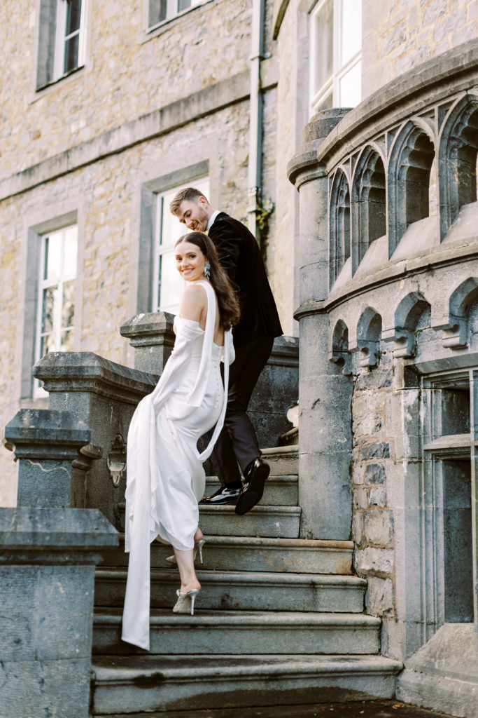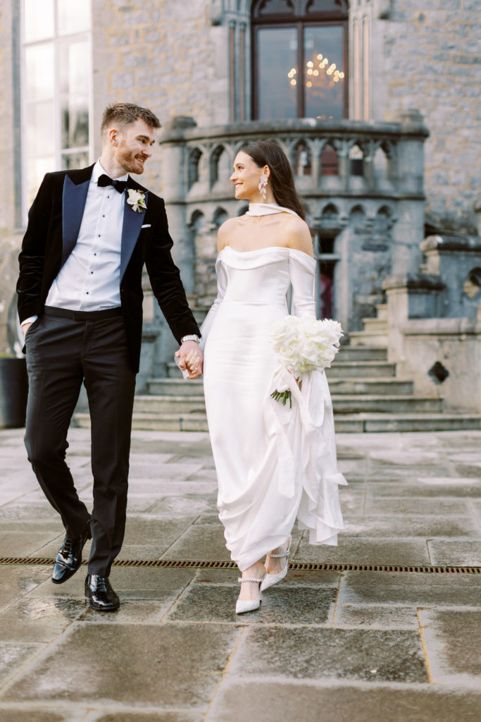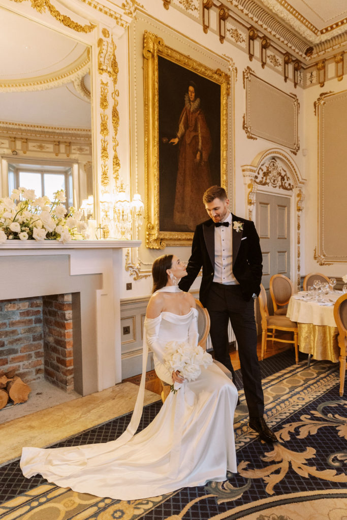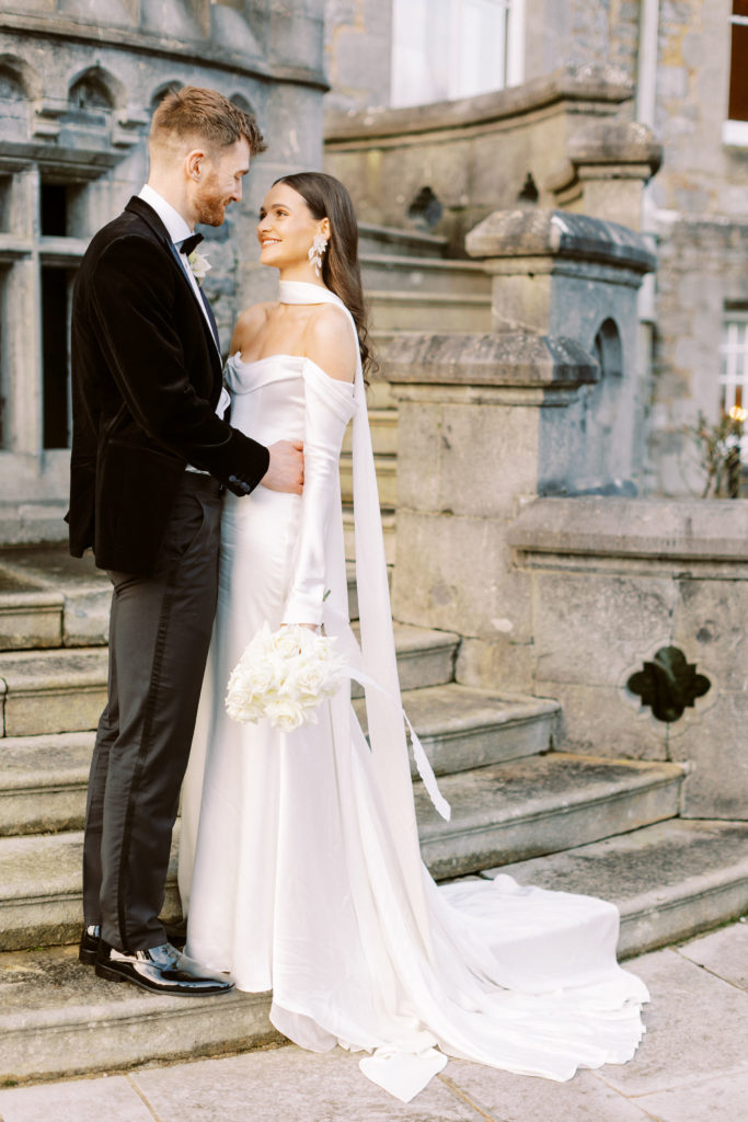 "Markree Castle was the first venue we viewed, and it was love at first sight for both of us." Wandering through the castle, soaking in period features and furnishings, and the breathtaking dining rooms, you get a real sense of the authentic, old-world charm that you can only find in such a historic space. "We fell in love with everything about the place. For us, it was the perfect Christmas venue." To match their otherwise clean and refined aesthetic, the couple kept the decor simple for the reception. Decorating the tables with a serious amount of white taper candles in antique gold holders, black bows and single stem white roses for an elegant wintery look.
