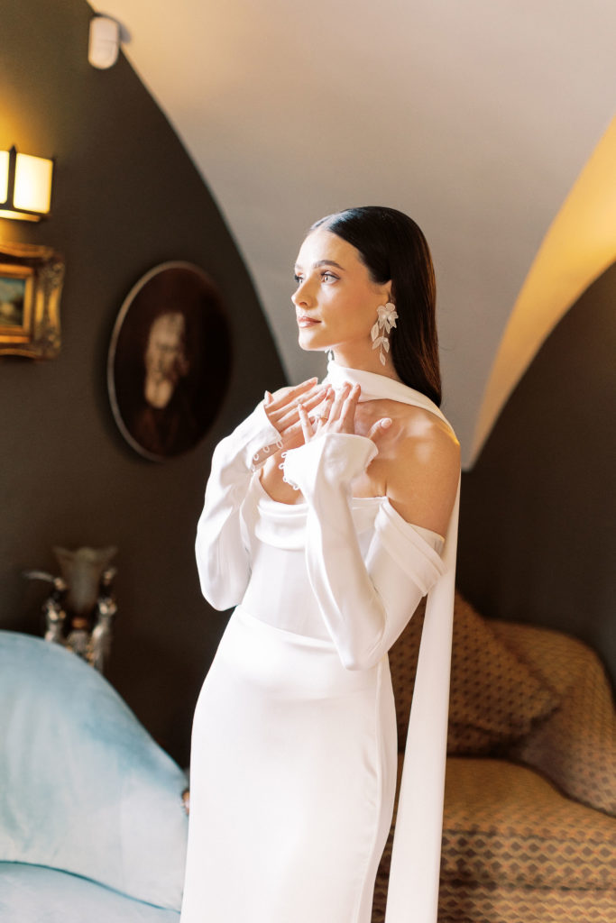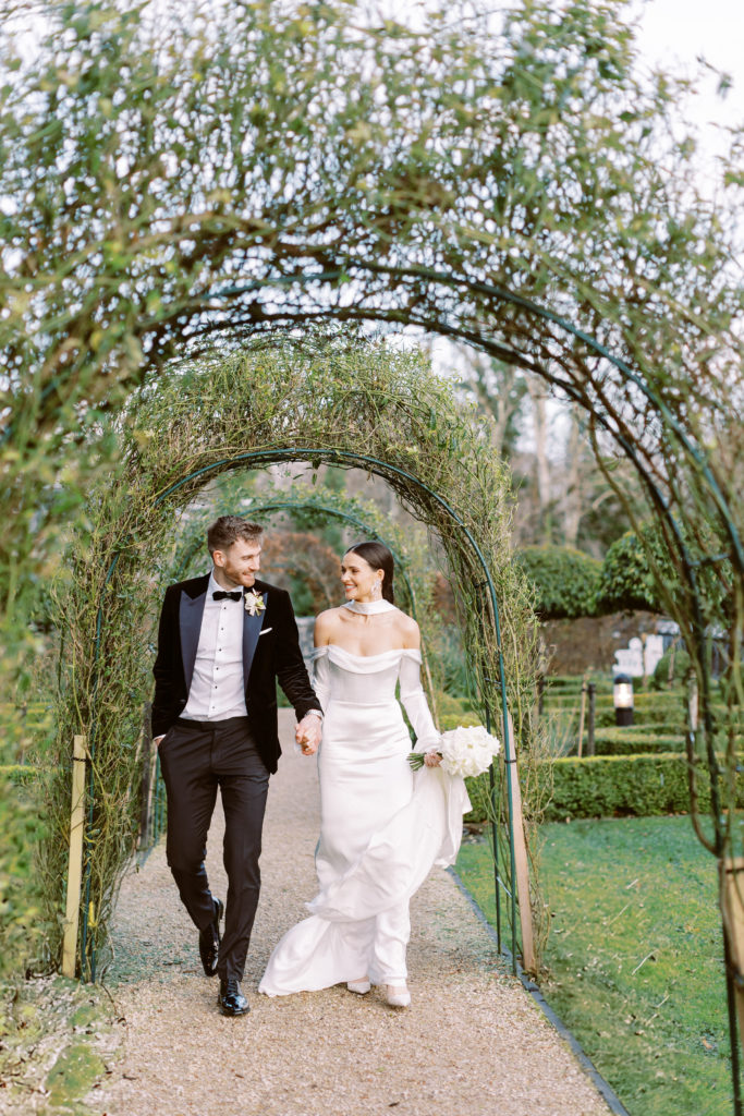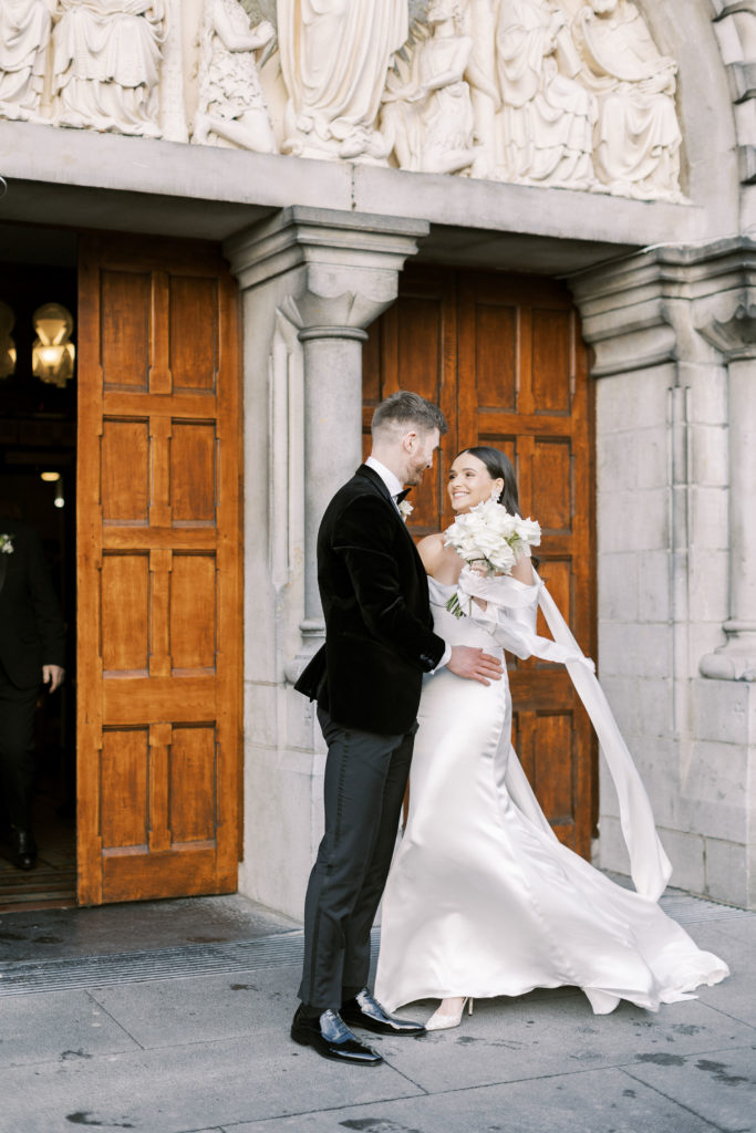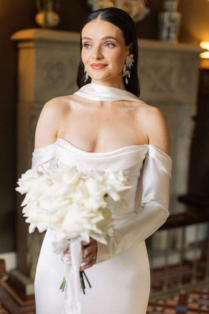 Eimear knew that she wanted a simple and elegant wedding dress, with the only mandatory detail being sleeves for their winter celebration. "I actually chose the neck scarf before I even found my dress. I didn’t want to wear a veil as I felt it didn’t suit me or my style!" She walked down the aisle in the Forsythia gown from Alexandra Grecco, a floor-length, white silk crepe with button detailing down the back and sleeves.