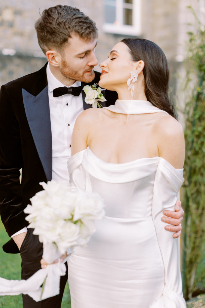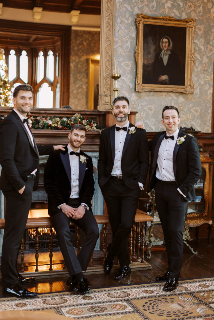 Conor went to Patrick Sheery in Dublin to have a custom suit made. As it was a Christmas wedding, he chose a black velvet tuxedo jacket with peak lapels and paired it with fitted black suit trousers; the whole ensemble turned out beautifully.