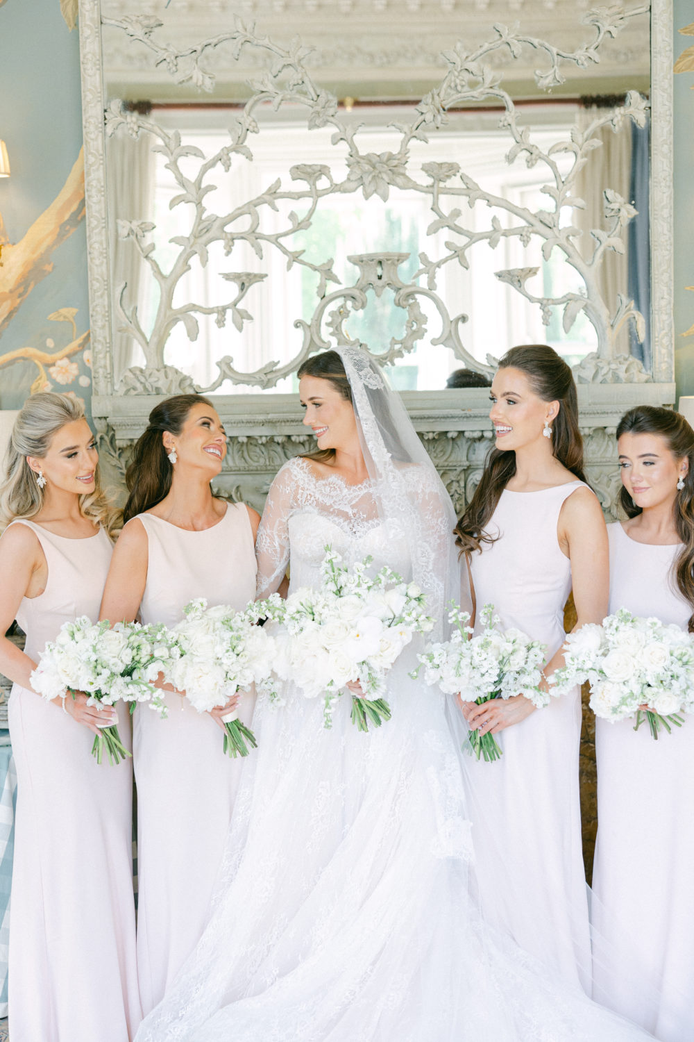 Blessed to come from such a large family, Michaela had no shortage of wedding party members; her four sisters were bridesmaids, and four brothers were ushers. "I actually ordered their dresses on the same day that I came home from saying yes to my own wedding dress! I knew from doing wedding party makeup in the past and seeing lots of bridesmaids in my time that less is always more." She chose a simple yet stunning design from Six Stories: a powder-pink gown with a high neck and a cowl-back drape.