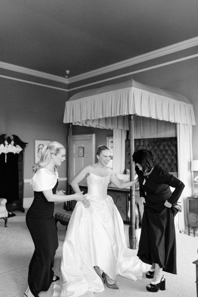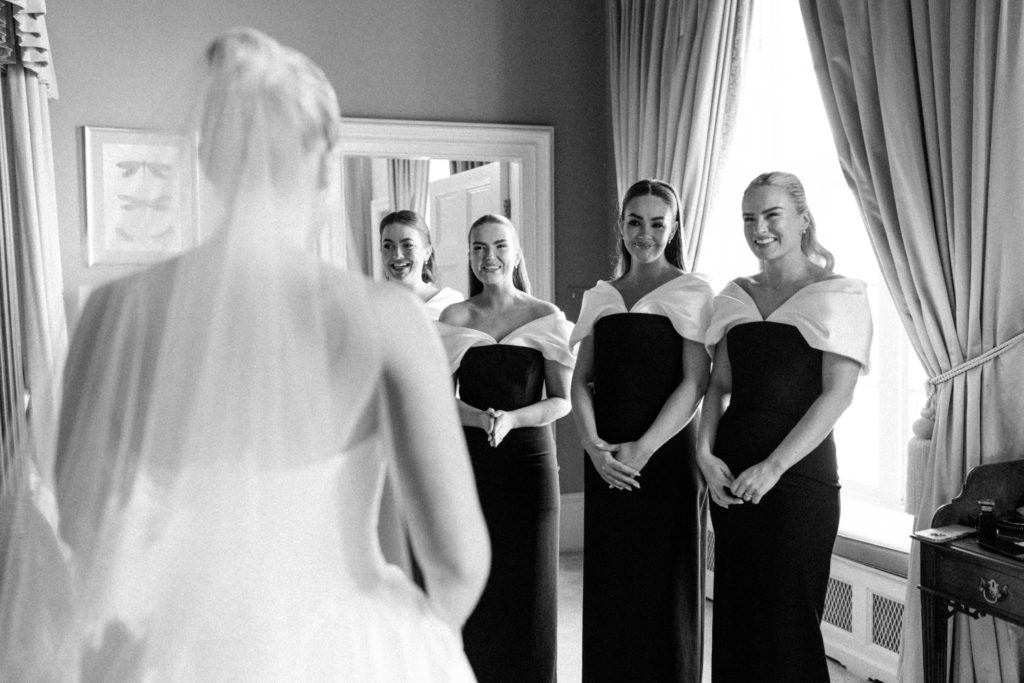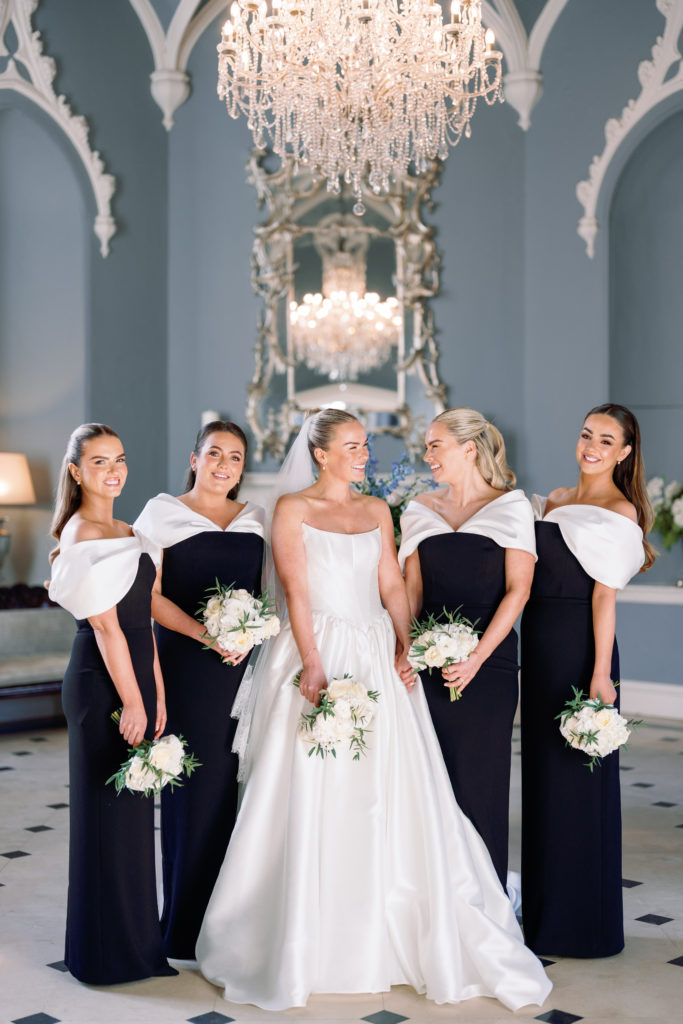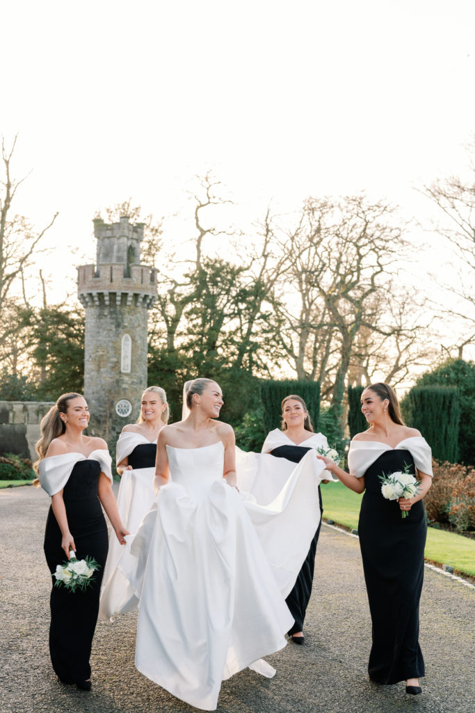 Niamh’s Maid of honour was, of course, her identical twin sister, Orla! Accompanied by Niamh's three best friends, Orna, Kelly and Kate. She found the Dakota Maxi Dress in Cream & Black from Solace London, and after that, nothing else really compared! For the styling, they kept things clean and straightforward, pairing black heels with small dangle earrings and a loose, pulled-back hairstyle to complement her own updo.