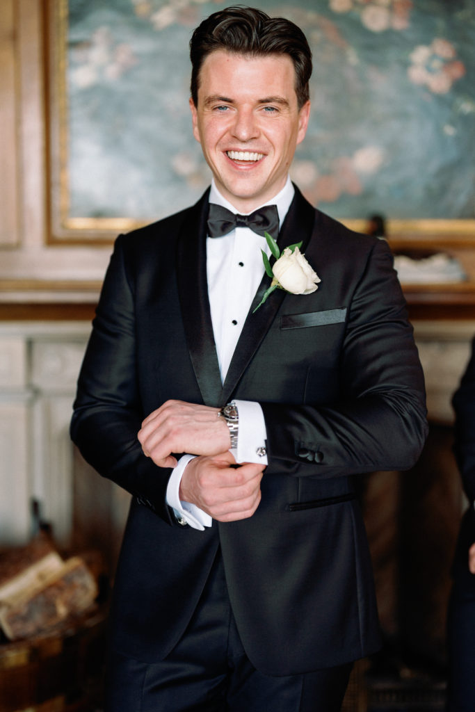 Brendan wanted a traditional look, and upon high recommendations from more than a few friends, decided to get his tuxedo at Abrahams. They offer a made-to-measure service for their wedding suits, so he was able to decide on almost every detail, down to the silk fabric of the blazer's shawl lapel.