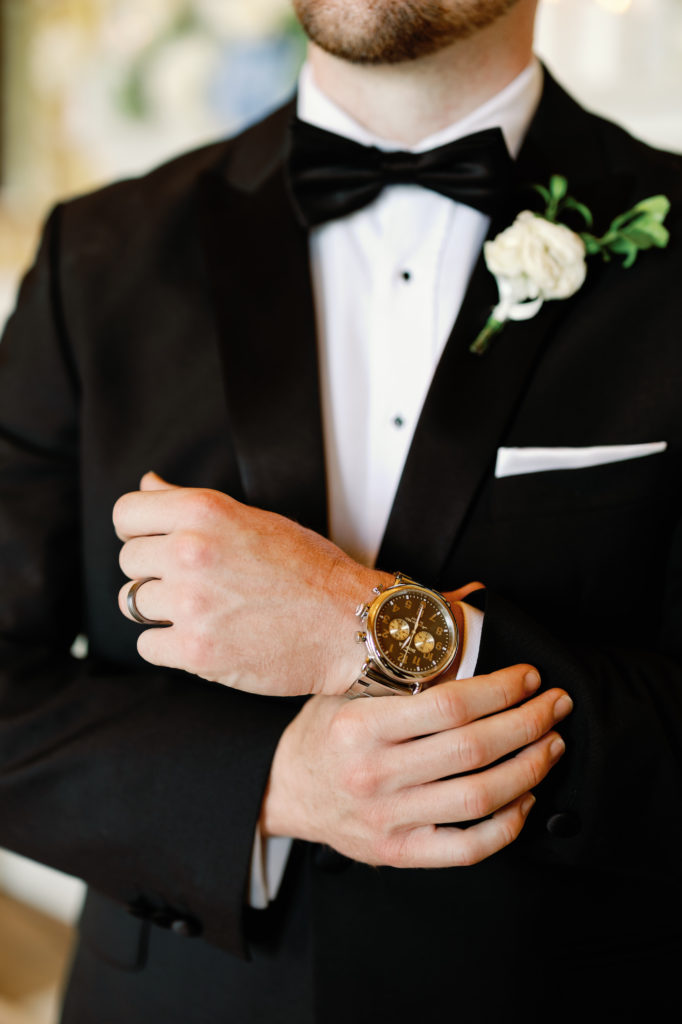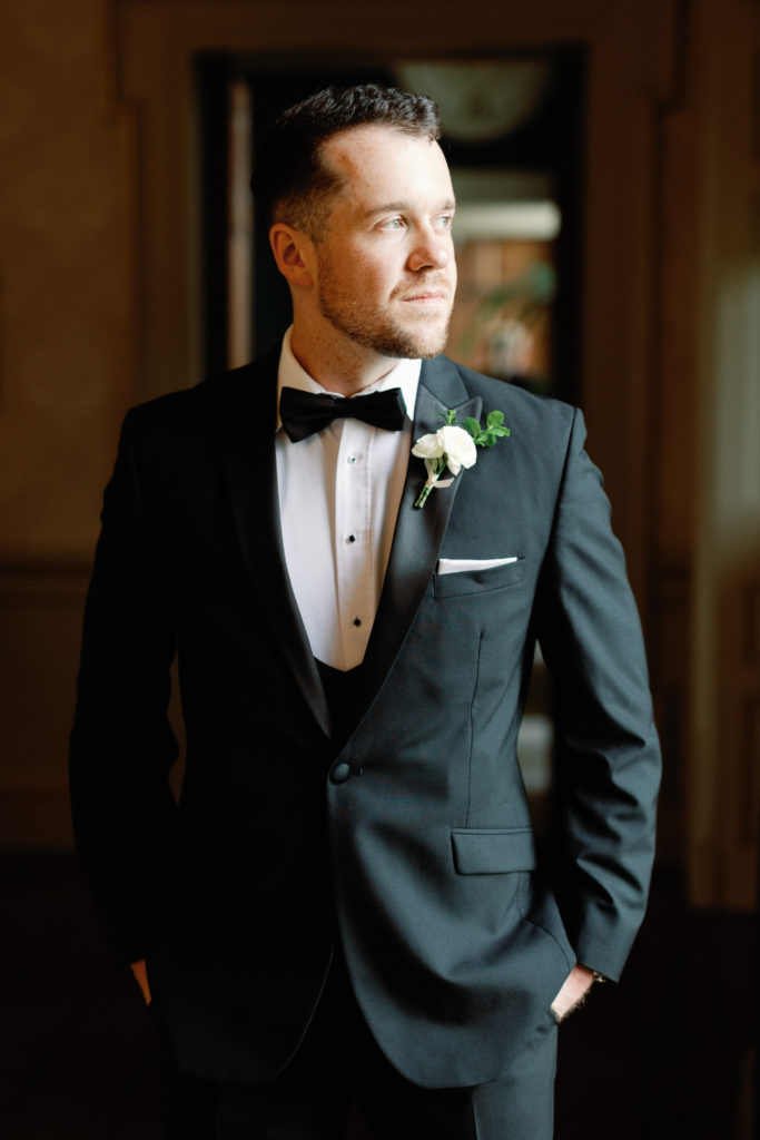 Patrick went and tried on a few options at CT2 suits, eventually finding and settling on a traditional peak-lapel black tuxedo.