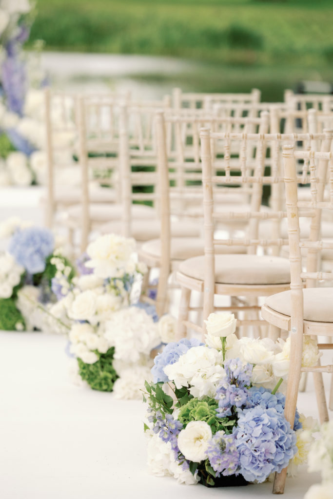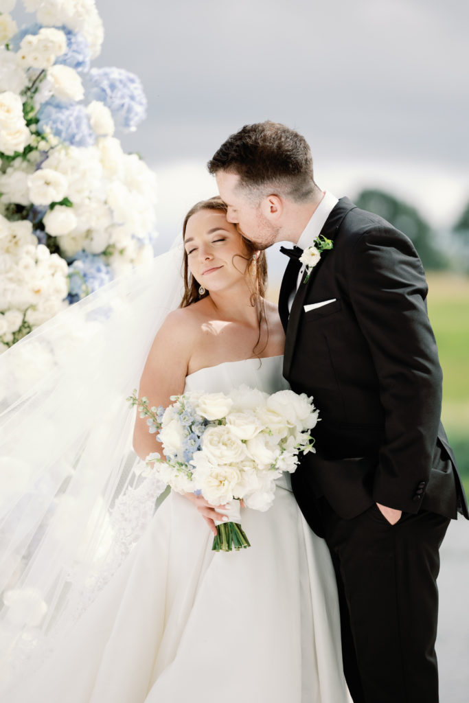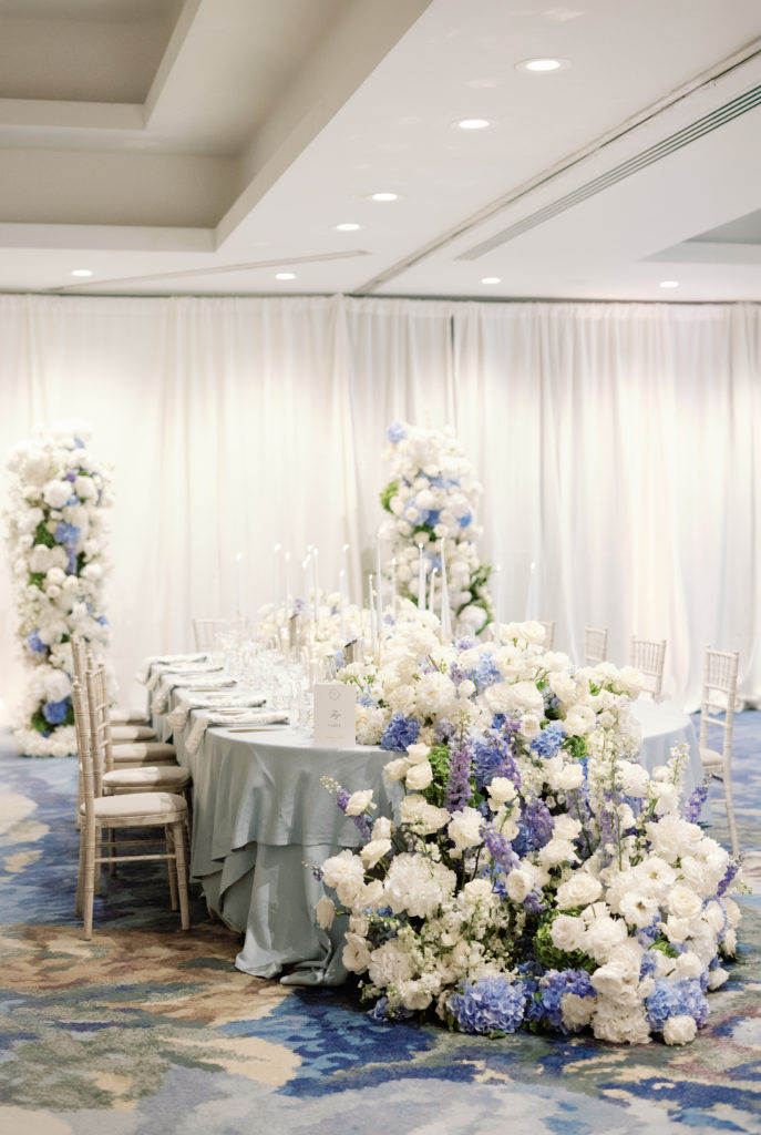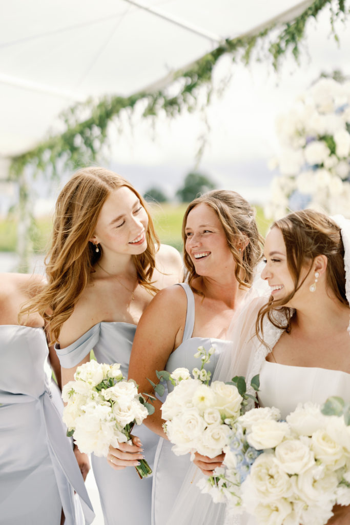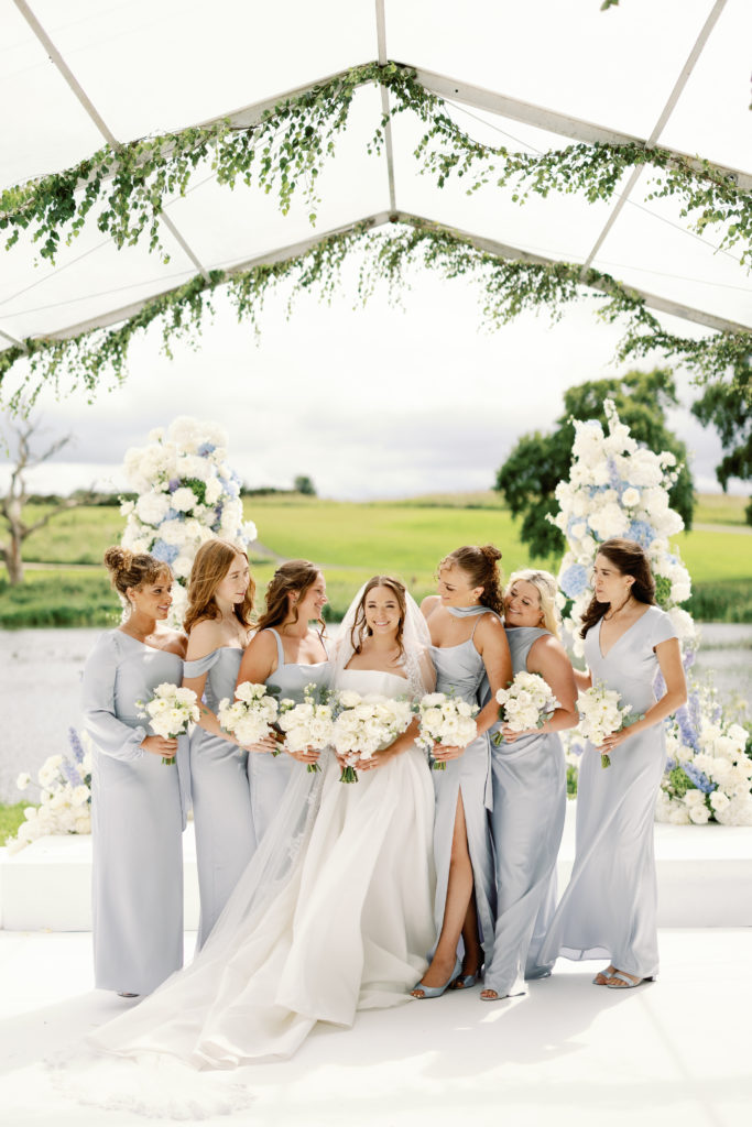 For her bridal party, McKenzie had six bridesmaids: her friends Taylor, Sydney, Jillian, and Jasmine, her cousin Becca and Patrick's younger sister Logan. They all wore Jenny Yoo dresses in Luxe Satin, in the colour Whisper Blue. "I wanted everyone to feel comfortable and confident, so they each chose their own dress style as long as no one else had already claimed it."